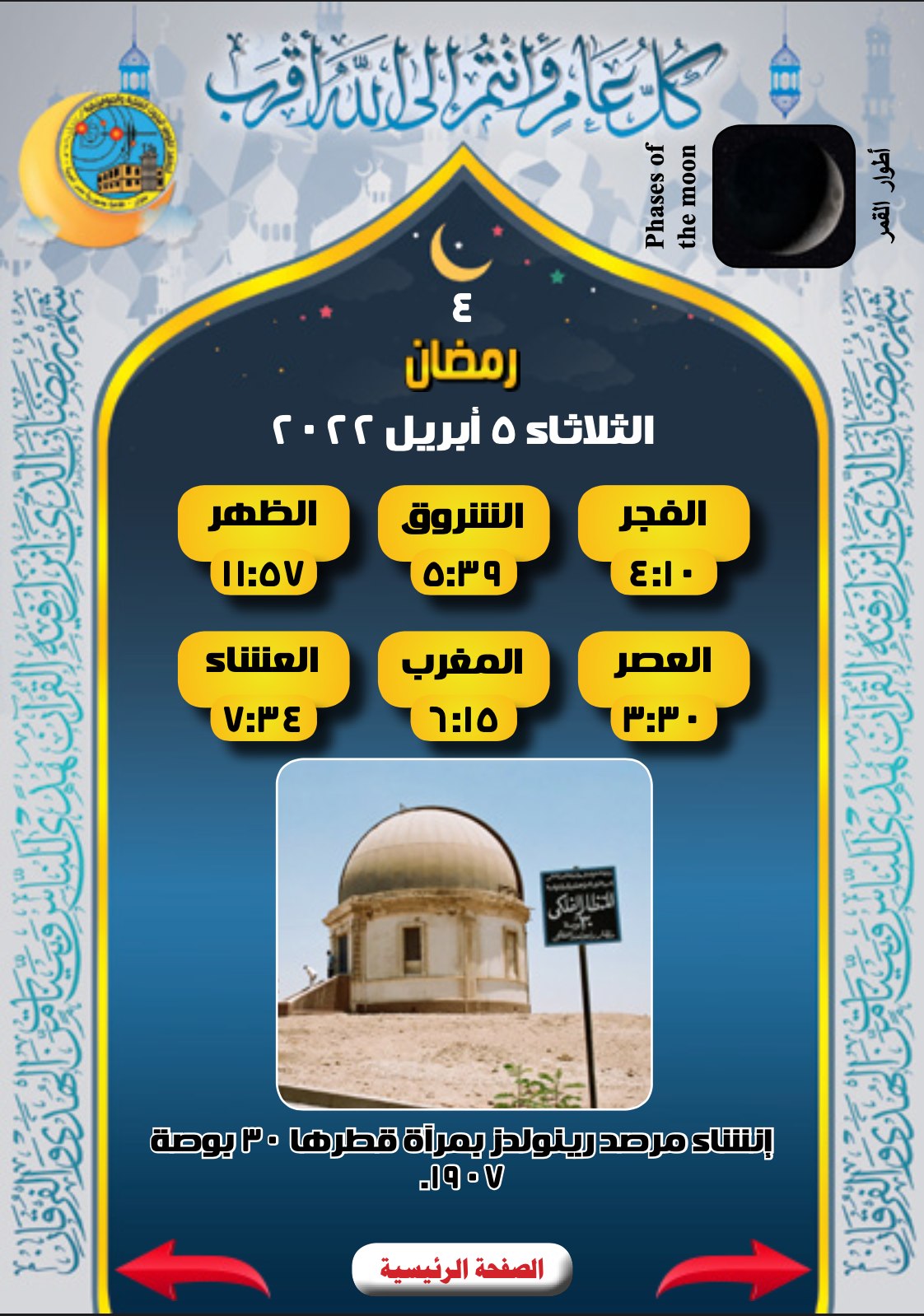 وأوضحت الإمساكية أن رمضان 2022 وفقًا للحسابات الفلكية سيكون أول أيامه الموافق السبت 2 أبريل، مشيرين إلى أن موعد آذان المغرب سيكون في تمام الساعة الـ 6:13 دقيقة بتوقيت القاهرة.