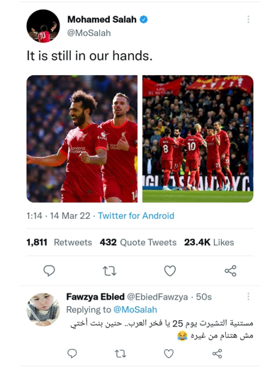 وتابعت: «أنا كنت هطبع لها تيشيرت عليه صورة صلاح، وبعدين بعد هزيمة المنتخب في أمم إفريقيا قلت لازم أروح الاستاد أشجع مصر وساعتها قلت لها هجيب لك التيشيرت من فخر العرب ومن وقتها وهي كل ما أكلمها في التليفون وأقولها أجيب لك إيه وأنا جايه من السفر تقولي صلاح».