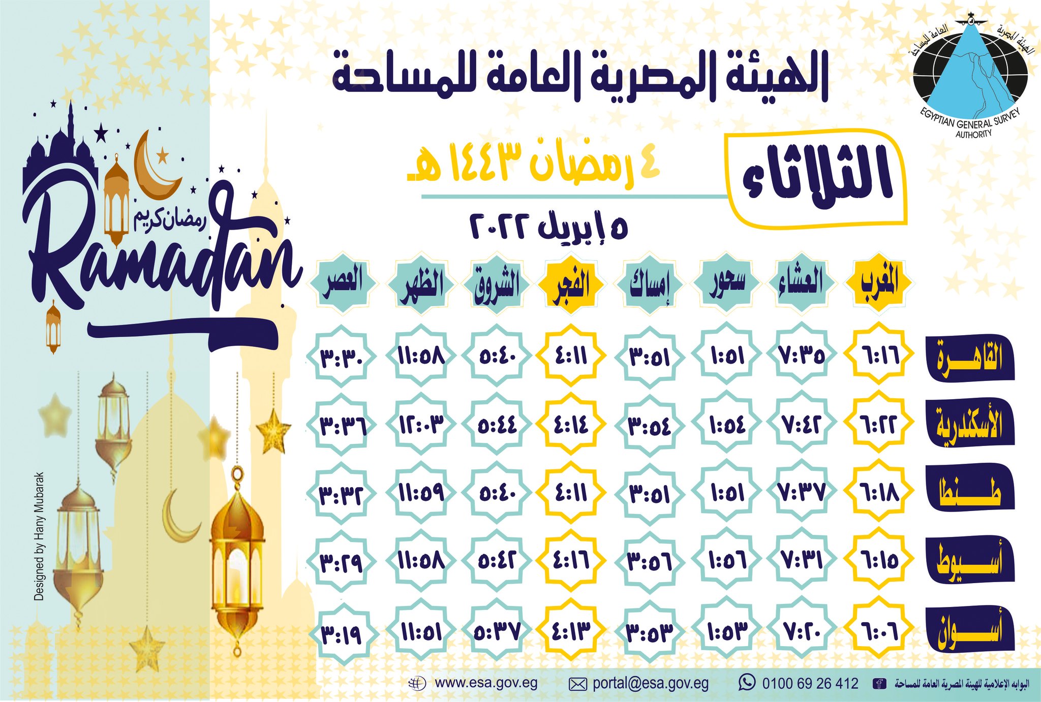 ويمكنك مطالعة كافة مواقيت الصلاة في جميع محافظات ومدن الجمهورية الثلاثاء رابع أيام رمضان الموافق 5/4/2022 عبر الضغط هنـــــــــــــــــــا