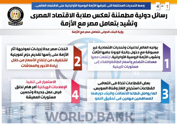 وأشاد البنك الدولي ، بالدور المصري في اتخاذ عدة إجراءات لمواجهة آثار الأزمة على رأسها تقديم حزم تمويلية للتخفيف من ارتفاع الأسعار من خلال زيادة الأجور والمعاشات، حتى تعافت بعض القطاعات كقطاعات استخراج الغاز وقناة السويس كما يواصل قطاعي الاتصالات والبناء دورهما كمساهمين مهمين في تحقيق النمو.