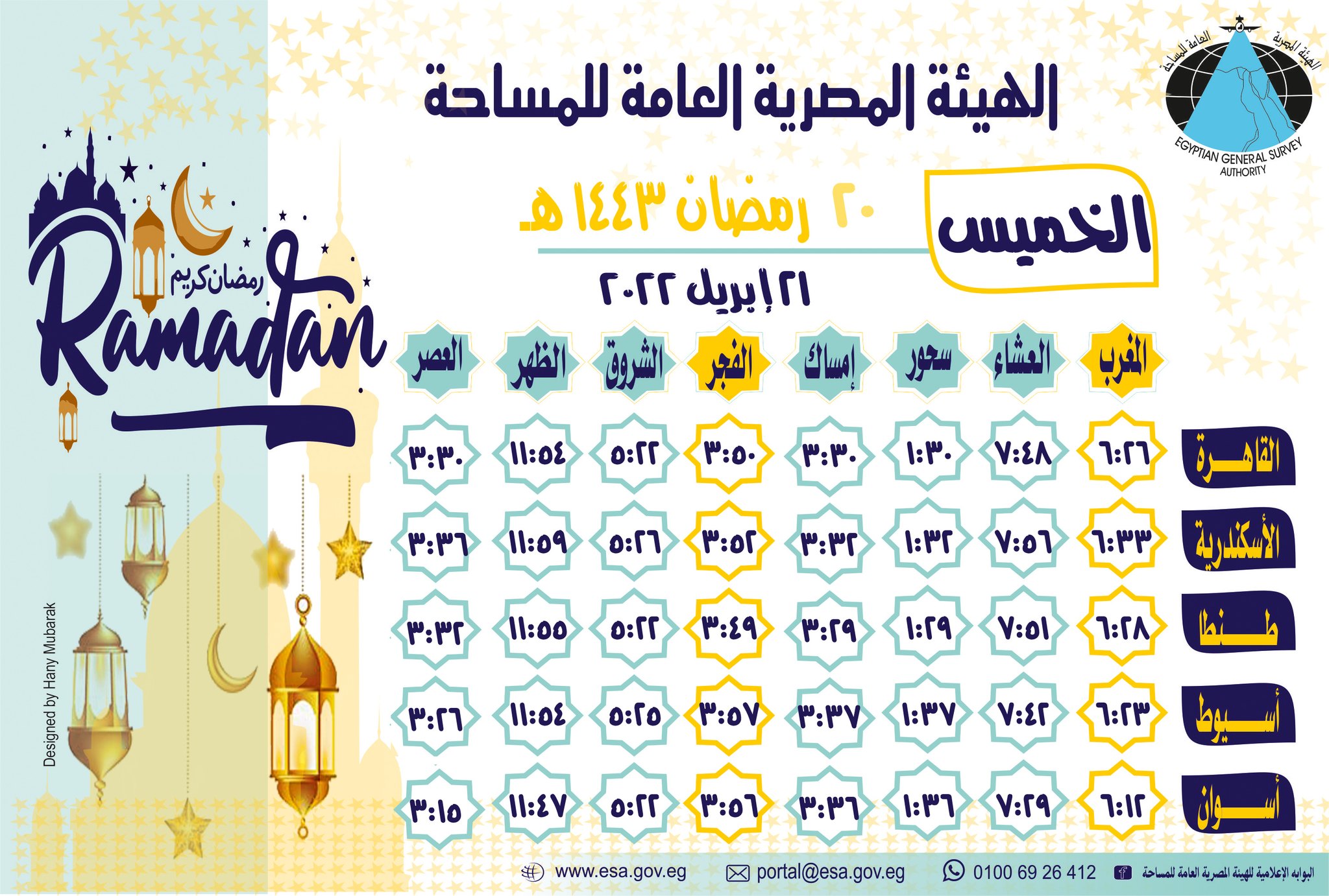 ويمكنك مطالعة كافة مواقيت الصلاة في جميع محافظات ومدن الجمهورية اليوم الخميس 20 رمضان الموافق 21/4/2022 عبر الضغط هنـــــــــــــــــــا