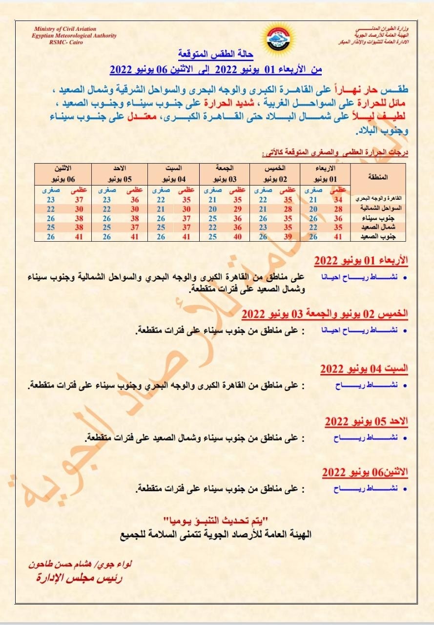 وإليكم بيان تفصيلي عن حالة الطقس خلال الأيام من الأربعاء 1 يونيو وحتى الاثنين 6 يونيو 2022 على كافة مدن وأنحاء الجمهورية.