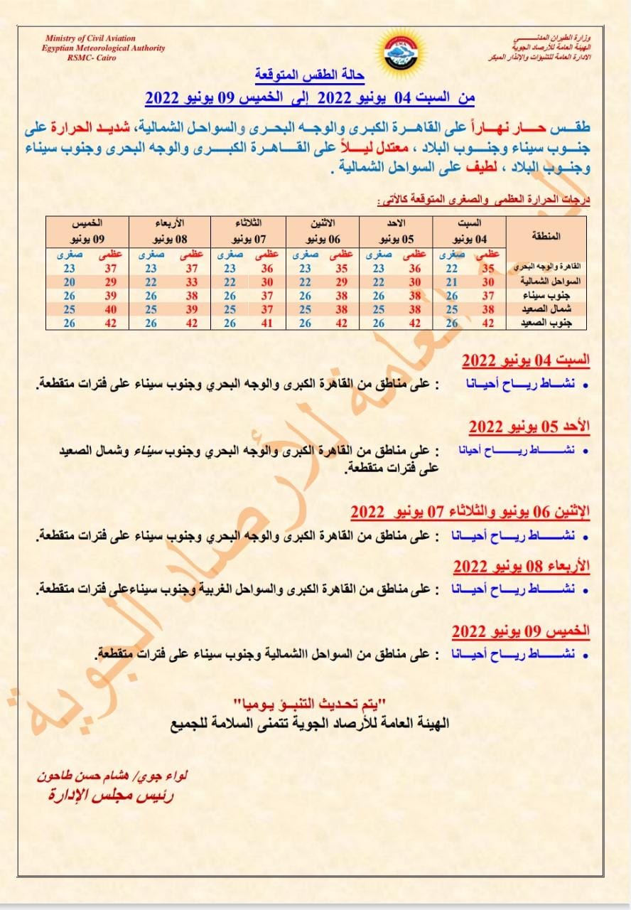 كشفت الهيئة العامة للأرصاد الجوية، عن حالة الطقس المتوقعة خلال الفترة من السبت 4 يونيو وحتى الخميس 9 يونيو 2022 على كافة مدن وأنحاء الجمهورية.