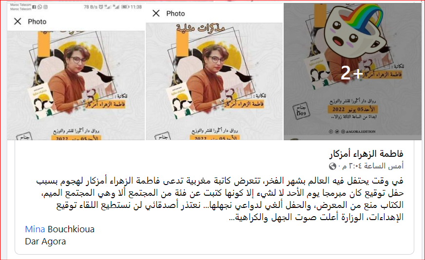 الكاتبة فاطمة الزهراء أمزكار، قالت في منشور لها عبر حسابها على موقع التواصل الاجتماعي «فيس بوك»: «في وقت يحتفل فيه العالم بشهر الفخر، تتعرض كاتبة مغربية تدعى فاطمة الزهراء أمزكار لهجوم بسبب حفل توقيع كان مبرمجا يوم الأحد لا لشيء إلا كونها كتبت عن فئة من المجتمع ألا وهي المجتمع الميم، الكتاب منع من المعرض، والحفل ألغي لدواعي نجهلها، نعتذر أصدقائي لن نستطيع اللقاء توقيع الإهداءات، الوزارة أعلت صوت الجهل والكراهية».