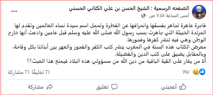 وأكمل الكتاني: «معرض الكتاب هذه السنة في المغرب ينشر كتب الكفر والفجور والعهر بين أبنائنا بكل وقاحة، وبالمقابل يضيق على كتب الدين والفضيلة؛ ألا من يغار على القية الباقية من دين الله من مسؤولي هذه البلاد فيمنع هذا العبث؟؟«.