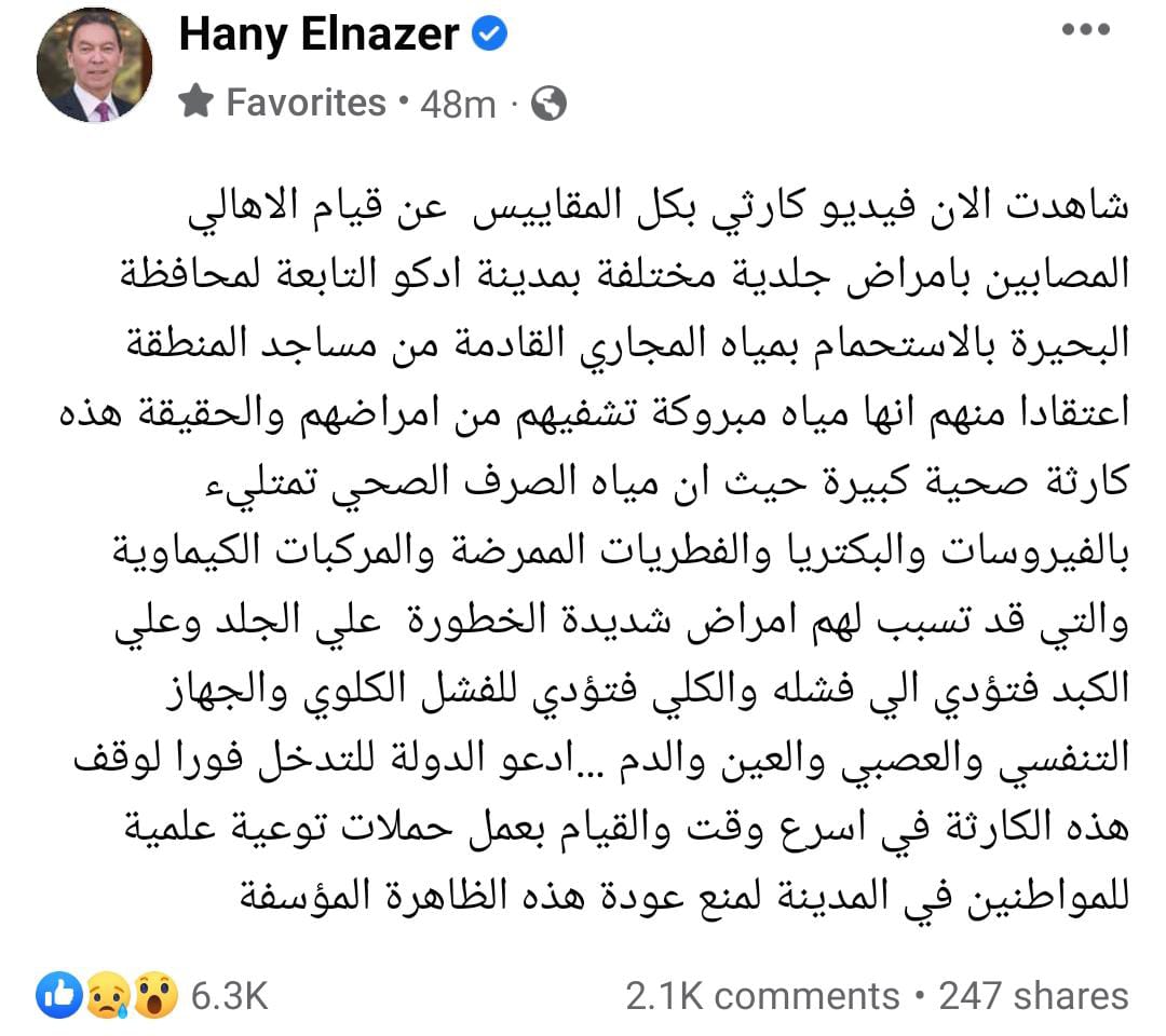 وقال الناظر، في منشور له عبر صفحته على موقع التواصل الاجتماعي "فيسبوك": "شاهدت الآن فيديو كارثي بكل المقاييس عن قيام الأهالي المصابين بأمراض جلدية مختلفة بمدينة إدكو التابعة لمحافظة البحيرة بالاستحمام بمياه المجاري القادمة من مساجد المنطقة اعتقادا منهم أنها مياه مبروكة تشفيهم من أمراضهم".