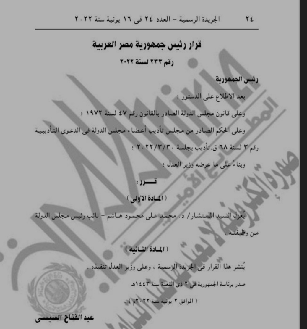 أصدر الرئيس عبدالفتاح السيسي قرارا جمهوريا برقم 233 لسنة 2022، بعزل المستشار محمد علي محمود هاشم، نائب رئيس مجلس الدولة من وظيفته.