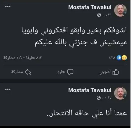 حيث كتب الشاب والذي يدعى مصطفى توكل في منشوره الأخير:" أشوف وشكم بخير..وأبويا ميمشيش فى جنازتي أرجوكم".
