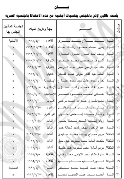 نشرت الجريدة الرسمية قرار وزير الداخلية اللواء محمود توفيق رقم 1133 لسنة 2020 الذي نص على السماح لـ 21 مواطنا بحمل جنسيات أجنبية وعدم الاحتفاظ بالجنسية المصرية.
