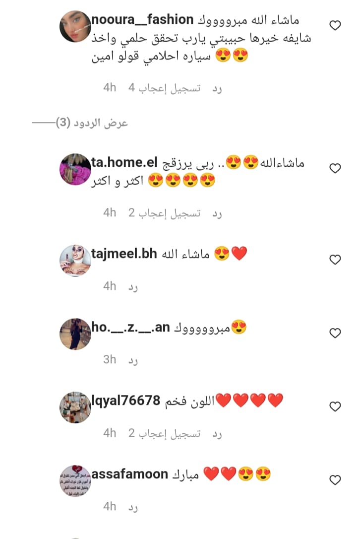 كما نشرت عقب ذلك على حسابها عبر موقع إنستجرام مقطع فيديو للسيارة، وعلقت عليه بـ ربي يرزقني خيرها ويجنبني شرها.
